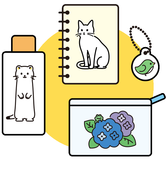 アクリルグッズ(キーホルダーやアクリルスタンド等)・ボールペン・ノート・缶バッジなど様々なグッズをお作りします。一貫してのセットアップにも対応可能で、ご予算に合わせて袋や台紙もトータルでご提案します。